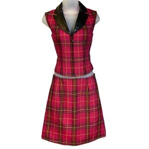 Vintage Y2K Cache Wool Plaid and Leather Vest and Skirt Set