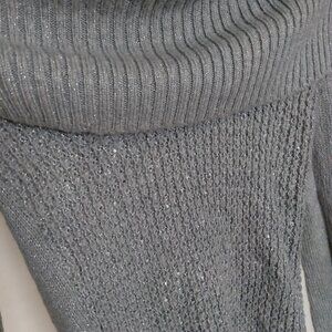 Vintage Y2K Candie's grey/gray off the shoulder knit sweater with a ribbed neckline, hem, and cuffs. The front has silver sequins and there is metallic thread woven through the sweater. Size small. Made of 55% acrylic, 43% polyester, and 2% other fibers. In good condition.