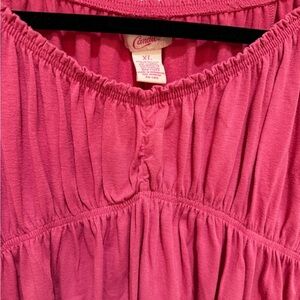This vibrant pink babydoll blouse by Candie's features a smocked neckline and cap sleeves, offering a relaxed and feminine silhouette. The ruched details and empire waist create a flowing fit, perfect for warm weather.