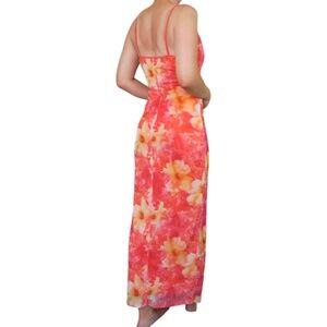 Bright vibrant large floral pattern in shades or pink, orange, red & yellow. Features; sleeveless spaghetti straps, ruched bust, scoop neckline with ruffle trim, slit on the left side, maxi length. Made in the USA. 100% polyester