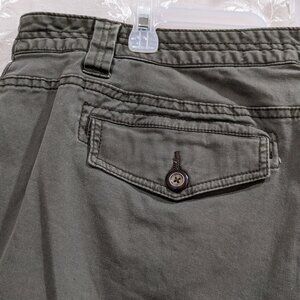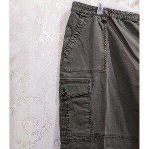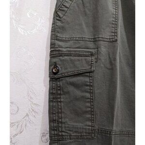 A pair of loden green Merona cargo pants, in size 24W. Vintage, from the 2000s! These comfy cotton cargo pants feature two side slash pockets, two button flap leg pockets, and two button back pockets for plenty of style and storage. High rise, relaxed fit. 98% cotton, 2% spandex, machine washable. 13 inch rise, 44 inch waist, 31.5 inch inseam.