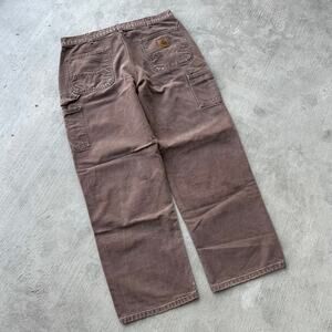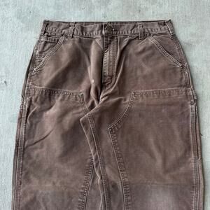 Vintage Y2K Carhartt DKB brown double knee work wear carpenter pants. Great fade on this pair! Few small tears. Measure 35x29 and an 9.5 inch leg opening. Please check measurements before purchasing. I do my best to show any flaws in pictures. Quick shipping! Bundles encouraged!