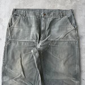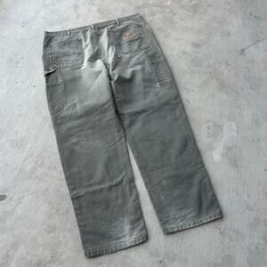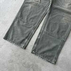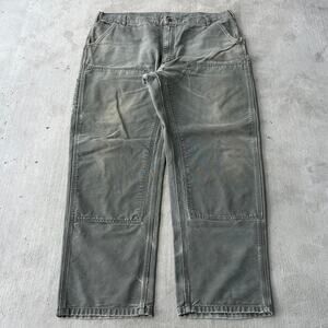 Vintage Y2K Carhartt MOS green double knee work wear carpenter pants. Good fade on these! Repair done to tear on seat hem. Measures 42x33 and a 10 inch leg opening. Please check measurements before purchasing. I do my best to show any flaws in pictures. Quick shipping! Bundles encouraged!