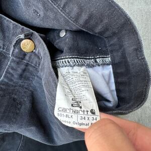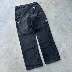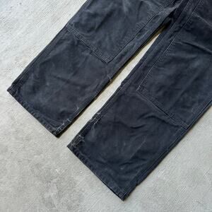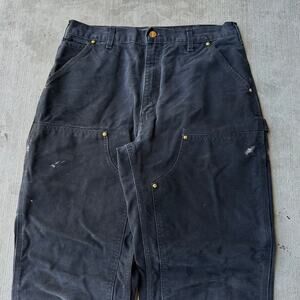 Vintage Y2K Carhartt black double knee work wear carpenter pants. Slight fade on these. Few small tears and stains. Measures 33x32 and a 9.5 inch leg opening. Please check measurements before purchasing. I do my best to show any flaws in pictures. Quick shipping! Bundles encouraged!