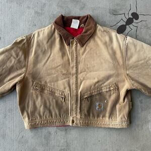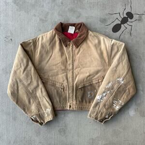Vintage Y2K Carhartt brown cropped Detroit style work wear jacket. Nice fade to this one! Paint and dirt stains throughout. Measures 25.5x21. CUT FROM COVERALLS SO THE ZIPPER DOES NOT WORK!!! Please check measurements before purchasing. I do my best to show any flaws in pictures. Quick shipping! Bundles encouraged!