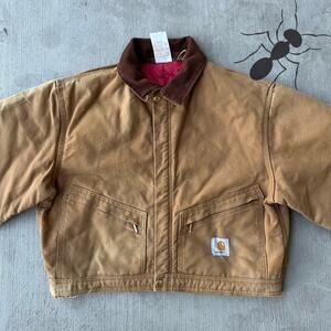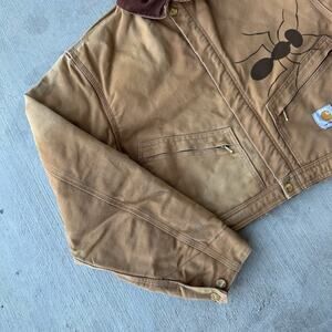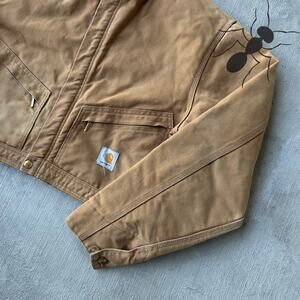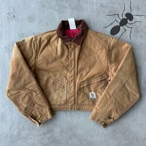 Vintage Y2K Carhartt brown cropped Detroit style work wear jacket. Nice one! Fading and discoloration throughout. Measures 23x21. CUT FROM COVERALLS SO THE ZIPPER DOES NOT WORK!!! Please check measurements before purchasing. I do my best to show any flaws in pictures. Quick shipping! Bundles encouraged!