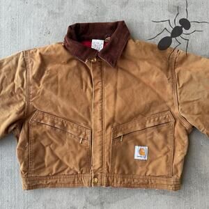 Vintage Y2K Carhartt brown cropped Detroit style work wear jacket. CUT FROM COVERALLS SO THE ZIPPER DOES NOT WORK!!! Measures 23x19. Please check measurements before purchasing. I do my best to show any flaws in pictures. Quick shipping! Bundles encouraged!
