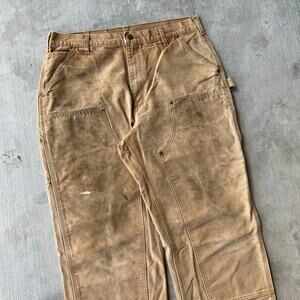 Vintage Y2K Carhartt brown double knee work wear carpenter pants. Bit of stainage on the front. Measure 35x35 and a 9.5 leg opening. Please check measurements before purchasing. I do my best to show any flaws in pictures. Quick shipping! Bundles encouraged!