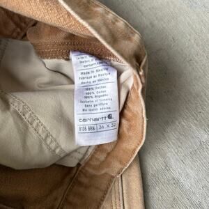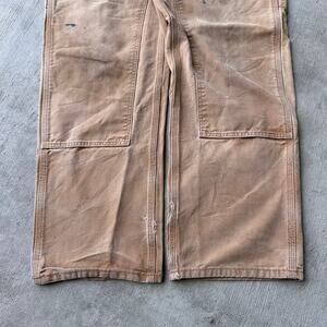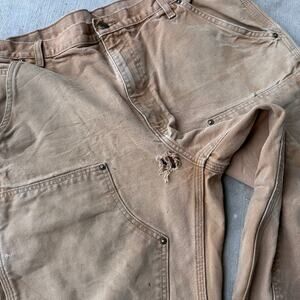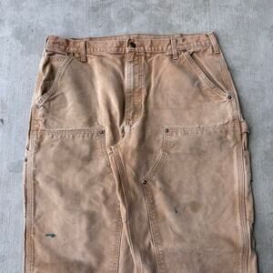 Vintage Y2K Carhartt brown double knee work wear carpenter pants. Marks and stains throughout. Hole at crotch looks pretty easily repairable. Measures 36x30.5 with a 9.5 inch leg opening. Please check measurements before purchasing. I do my best to show any flaws in pictures. Quick shipping! Bundles encouraged!
