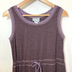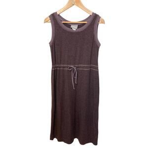 Dress: sleeveless, round neck, drawstring waist w/ tie front, knee or midi length.