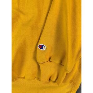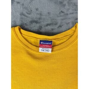 * Design: Bright yellow crewneck sweatshirt with embroidered Champion logo on chest and patch on sleeve