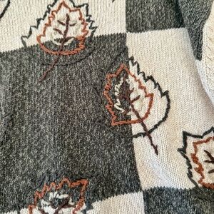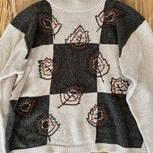 Vintage Y2K Checkered Fall Leaves Mock Neck Neutral Sweater Sz S