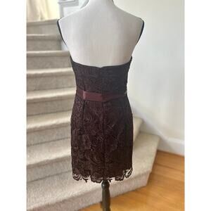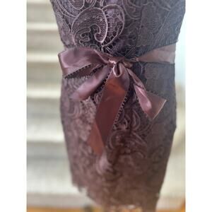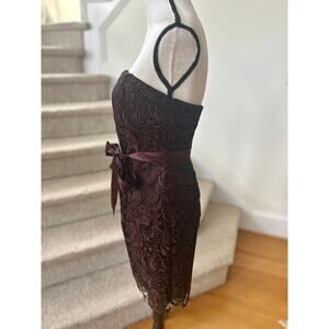 Excellent condition. Vintage y2k style mini dress. Brown floral paisley lace, strapless, with delicate bow at waist. Back zipper.