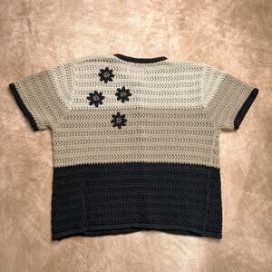 Hand embroidered color block tan / cream / black sweater with flowers on the front and back. Button closure, short sleeves. Vintage Y2K, dated 2002.