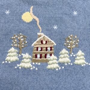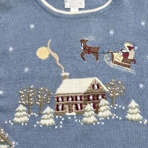 Long sleeve, tight knit material, front and back embroidery of a cabin, snow, trees and Santa Claus & reindeer in a sleigh. Rounded neckline, pullover style. Vintage 2000s, dated 2003.