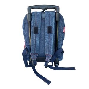 Good vintage condition with signs of wear to the edges of the denim, a small tear at the shoulder strap and one of the top compartment zippers doesn’t work (the other does, so the backpack still closes securely). The inside floor has some minor peeling. The handle goes up and down fine and the wheels roll smoothly. Tons of life left for the next generation to enjoy!