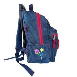 Vintage Clifford The Big Red Dog Roller Backpack. From the year 2000. Medium Wash denim with embroidered flowers on the front and sides and a large fuzzy Clifford embroidered appliqué on the front. Spellout Clifford The Big Red Dog at the top.