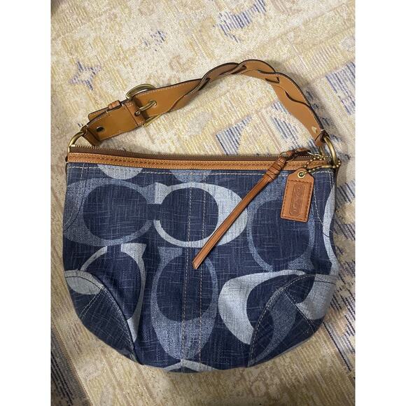 Vintage Authentic Coach Denim Hobo bag with solid brass hardware stamped with Coach logo.