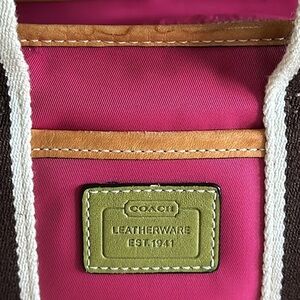 Add a pop of vibrant color to your wardrobe with the Coach Hot Pink Nylon Mini Hampton Tote. This eye-catching bag features durable hot pink nylon, accented with camel leather trim and lime green leather handles on off white and brown woven cotton straps for a playful yet sophisticated look. The compact design makes it perfect for daily errands or a casual outing, while the vinyl interior offers enough space to hold your essentials. Finished with Coach’s signature detailing and a practical zip-top closure, this mini tote combines style and function effortlessly.