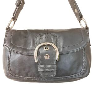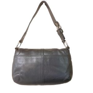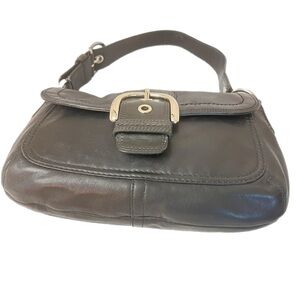 Vintage Coach leather shoulder bag from the heydays of the early 2000s. Chunky shiny silver hardware. Crafted from full grain cowhide leather. Two large compartments inside. One zipper pocket in 2nd compartment. Kangaroo pocket on the outside of the bag. Magnetic button closure.