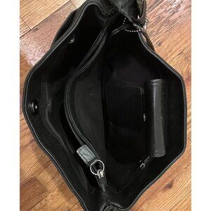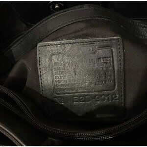 Leather Coach logo hangtag and logo plate on side of bag, logo stamped on leather base and inside.