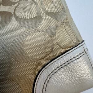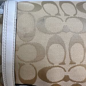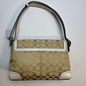 Vintage Y2K Coach Monogram Canvas and Leather Shoulder Bag. Tan monogram Canvas with white leather trim. Fully lined. Two compartments and several inner pockets. Twist lock clasp. A few places where canvas is discolored, see photos.