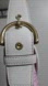 Color: White Leather-Pink/Lilac Jaquard Fabric with some Gold Trim around the bottom corners and backside of shoulder strap