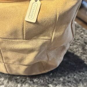 This vintage Y2K Coach Soho shoulder hobo bag features a patchwork design made of suede in a solid tan color. The bag has a zip closure, silver hardware, and a multicolor fabric lining. It is a medium-sized shoulder bag with a tan suede handle/strap, suitable for various occasions such as travel, parties, casual outings, workwear, or formal events. The bag also includes inner pockets for organization and is part of the Coach product line.