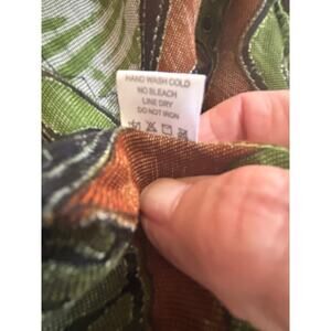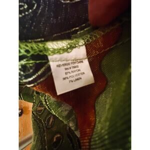 Fabric is Blend (Rayon, Linen, Polyester). Hand wash - hand dry - no iron.