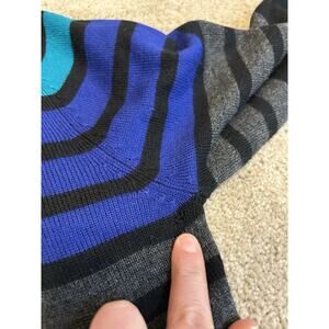Vintage Y2K Black, blue, and gray striped cowl neck midi length sweater dress.
