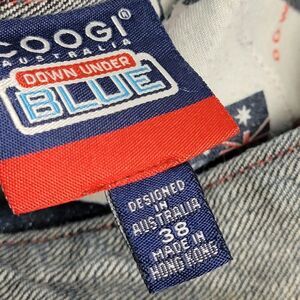 Vintage COOGI wide-leg denim jeans in blue with embroidered accents. These Y2K-inspired men's pants feature a relaxed fit, high rise, and a grunge/90s/hip hop theme. Made of medium-wash cotton denim, they have a 38-inch waist and 32-inch inseam, suitable for a size 38. These unique and stylish jeans offer a retro look with a baggy silhouette.