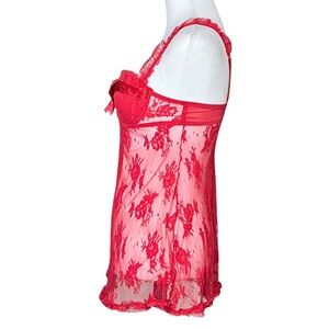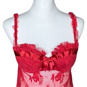 Sexy sheer red lace slip dress with lightly padded cups, ruffle trim, adjustable ruffled straps, and a satin bow from the early 00s by Ambrielle. Perfect for Christmas!
