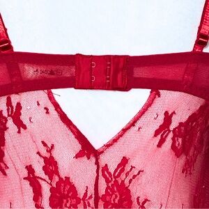 All over semi-sheer red floral pattern lace that is gathered in a ruffle design at the top of the bra cups. Extra ruffles on the straps and hem. Satin ribbon and bow at the bust. Bra closure and keyhole in the back.