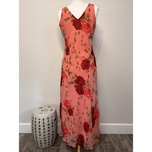 A true late-90s/Y2K chiffon maxi dress with the prettiest rose print. Features a bias-cut slip silhouette, scoop neckline, V-back. Coral base with red roses. Fully lined with semi-sheer chiffon overlay. Moves beautifully! Era 1997-2003