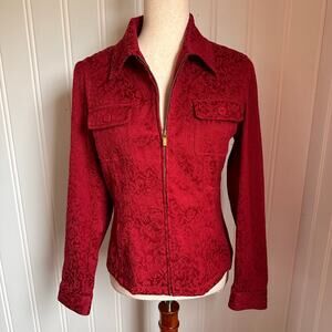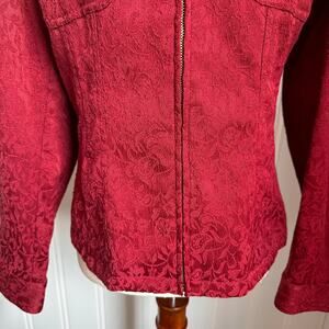 This vintage Y2K Jones New York Signature jacket is a size small. This tapestry jacket is red with a floral pattern. It has a zipper closure and has four pockets. It's a polyester/cotton/spandex blend and machine washable. This jacket has cottagecore vibes and is in good vintage condition.
