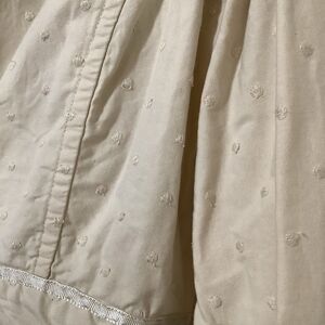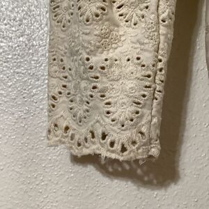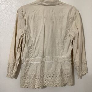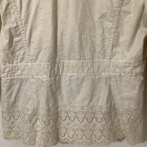 Old Navy Brand Vintage Y2K Boho Chic Bohemian Cottagecore Aesthetic Feminine Whimsical Cream Eyelet Lace Cutout Embroidered Polka Dot Blazer Jacket with Scalloped Hem and Multicolor Beaded and Buttons Details. Good condition-some wear on hems, loose threads, dots, pinhole as pictured. Size L. 100% Cotton. Fall 2005.