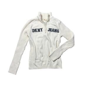 Vintage DKNY Jeans quarter zip sweater with logo lettering across the chest. Classic Y2K style with a fitted cut, ribbed sleeves/sides, and a cozy high collar with half zip.