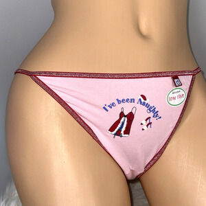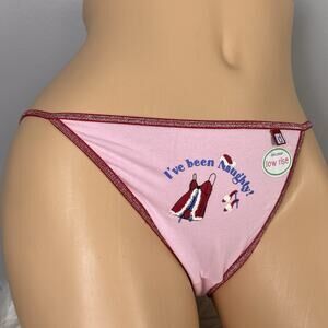 Listed is a vintage Y2K Delicates low rise string bikini panty, offered in pristine new with tags (NWT) condition. This unique retro piece features an adorable graphic that reads "I've been Naughty!" alongside playful holiday-themed imagery, perfect for adding a touch of humor to your lingerie collection.