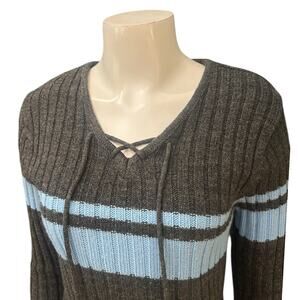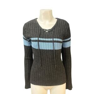 Vintage Y2K Derek Heart Ribbed Sweater Gray Blue Stripe Long Sleeve Knit –
