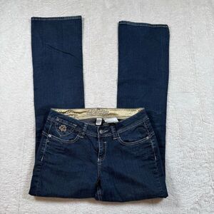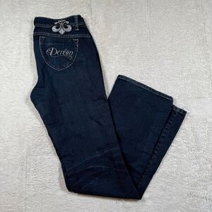 Vintage Y2K Dereon Women’s Navy Flare Jeans in gently used condition. Size women’s 7/8. Waist 14 3/4”, rise 7 1/2”, inseam 31 3/4”, leg opening 8 3/4”. 💎 2000s Urban Diva / House of Deréon Glam ✨