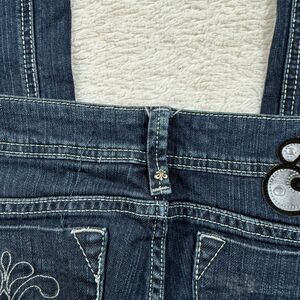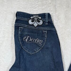 These jeans are pure Beyoncé-era House of Deréon—dark wash denim with bold pocket embroidery, rhinestone detailing, and that signature cursive branding. They channel the urban glam aesthetic of the mid-2000s, when jeans weren’t just casual but a full statement piece.