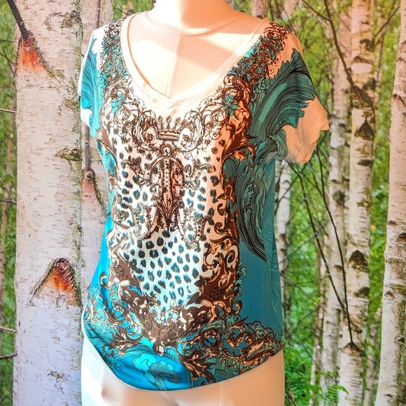 Vintage Y2K Designer Animal Print Crown Rhinestone Maximalist V Neck Tee