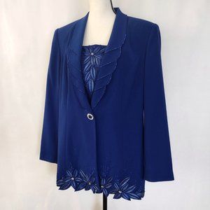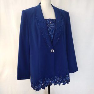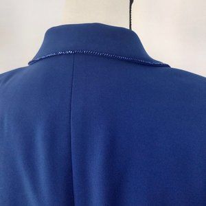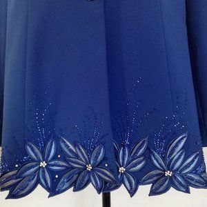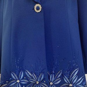 STUNNING blue jacket, featuring a unique, tiered lapel collar, and long sleeves. It has a single, jewel encrusted, button closure. Removeable modesty panel on the chest. There is beading on the collar, but most noticeably on the hem and panel. The hem and panel are decorated with beautiful 3D fabric flowers, shimmering beading, and diamond rhinestone jewels. This jacket is definitely an eye catcher. The color is a vibrant shade of blue. Flattering slimming silhouette, with built in shoulder padding.
