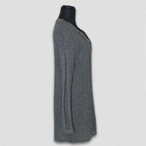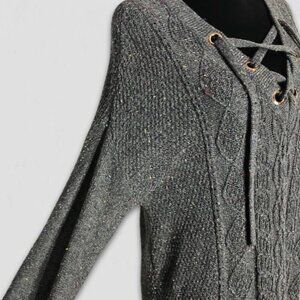 This vintage Y2K oversized gray cable knit sweater features a stylish laced-up V-neck and ribbed details. This sweater combines comfort and style. Perfect for layering or wearing solo, its relaxed fit and playful multicolored specks offer a casual yet fashionable look.