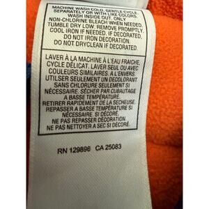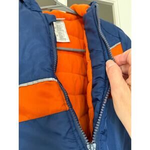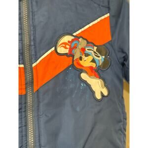 This is a fantastic vintage Disney racing jacket, perfect for any young Mickey Mouse fan or a collector of Disney memorabilia. The coat features a vibrant blue body with a bold orange and white racing stripe design that runs across the chest and down the left sleeve.