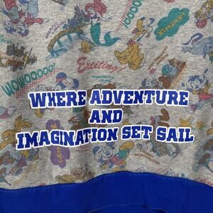 Authentic Tokyo DisneySea “01” Mickey Hoodie, released exclusively at Tokyo Disney Resort in Japan. This blend of vintage charm and park fandom features an allover Disney character print, bold “01” front graphic, and back text, “Where Adventure and Imagination Set Sail.”