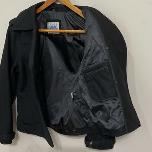 This unique coat blends the waist length cut of an Eisenhower jacket with the double breasted button closure of a Pea Coat.