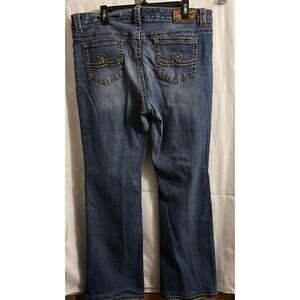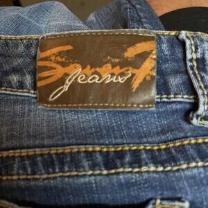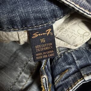 This product is a pair of vintage Y2K distressed SEVEN 7 blue denim jeans in a women's size 16. They feature a bootcut style with a mid-rise fit, made of a spandex and cotton blend material. The jeans have a solid pattern with a medium fabric wash, zip and button closure, and embroidered logo accents. Perfect for those who appreciate a grunge or 90s aesthetic, these machine washable jeans are a stylish addition to any wardrobe for the winter, fall, or spring seasons.