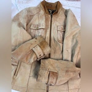 The leather is extremely broken in and distressed, with marks and wear throughout, giving it that authentic grunge-meets-Y2K edge. Despite the heavy wear, there are no holes, rips, or structural damage — just the natural patina and character that only decades of wear can create.