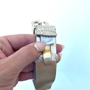 Condition: Good vintage – metallic stingray-texture leather is separating from the base in a few spots; could be glued back down. Still fully wearable. (Reason for significant discount)
